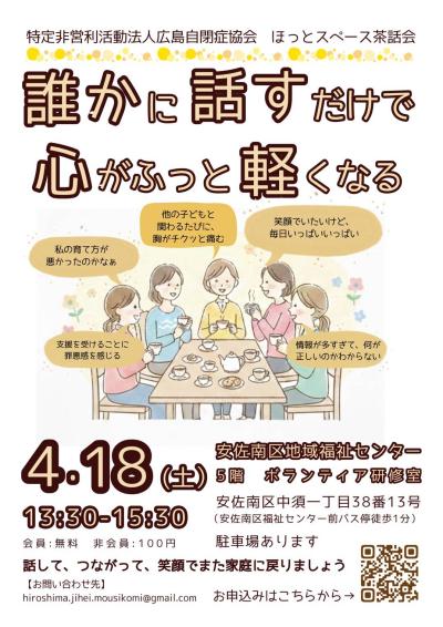 お知らせ公開日:2026年03月20日誰かにはなすだけで、ふっと心が軽くなる(ほっとスペース茶話会)誰かに話すだけで心がふっと軽くなる